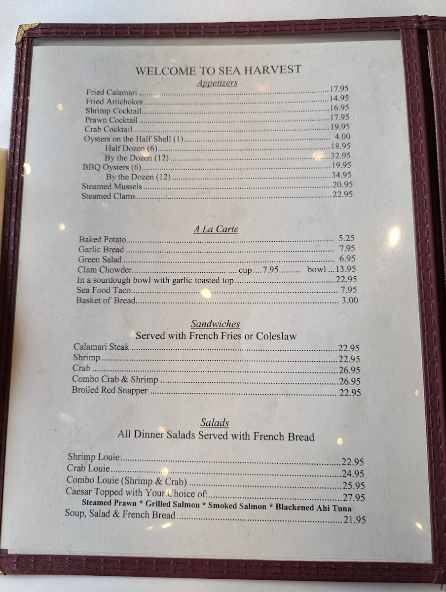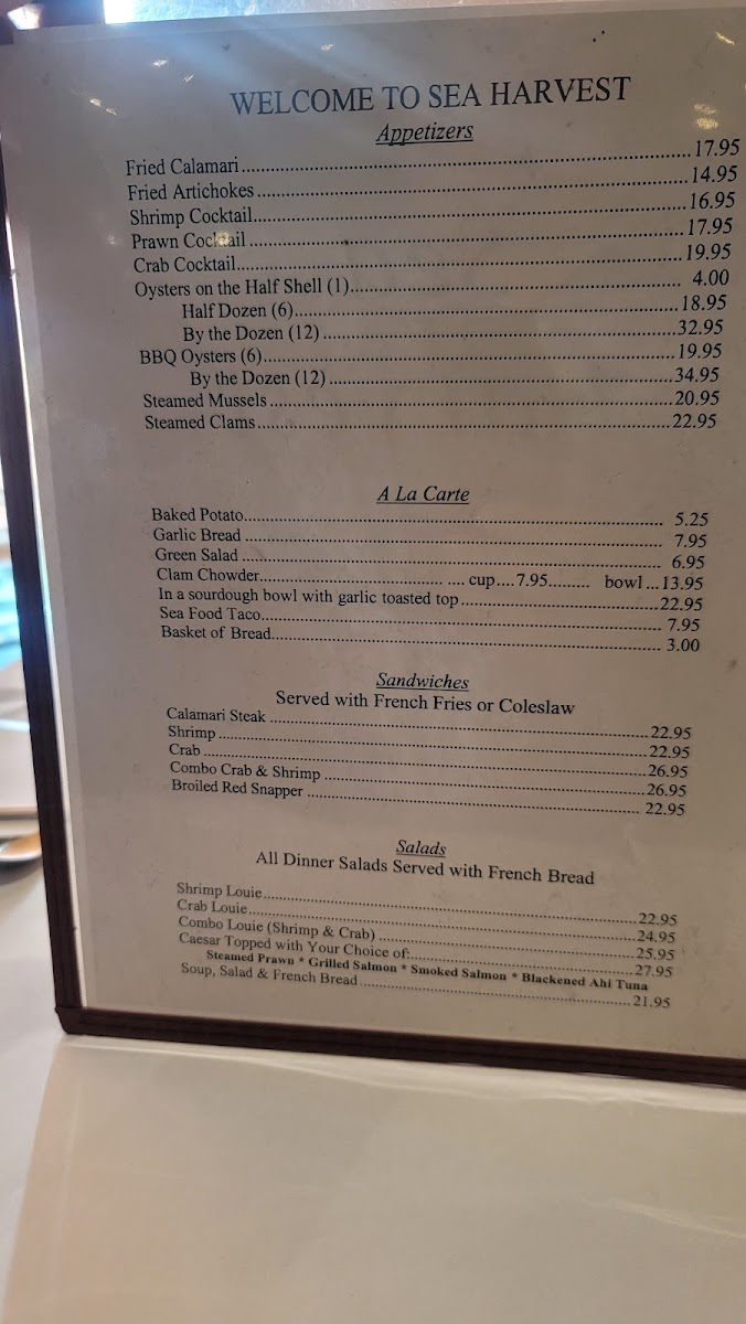 At Sea Harvest, the menu is a celebration of the ocean's bounty, featuring everything from succulent sandwiches to tempting broiled selections. Indulge in the Sea Harvest Cioppino, a hearty mix of fish, clams, prawns, mussels, crab, and scallops swimming in a rich tomato broth for just $35.95. If you prefer to savor seafood in a lighter format, the Seafood Taco, served with zesty jalapeno coleslaw, is a must-try at $24.95. For those looking for something classic, the Broiled Red Snapper, priced at $22.95, is lovingly prepared with a side of baked potato, salad, and broccoli, making for a wholesome meal that will leave you satisfied.